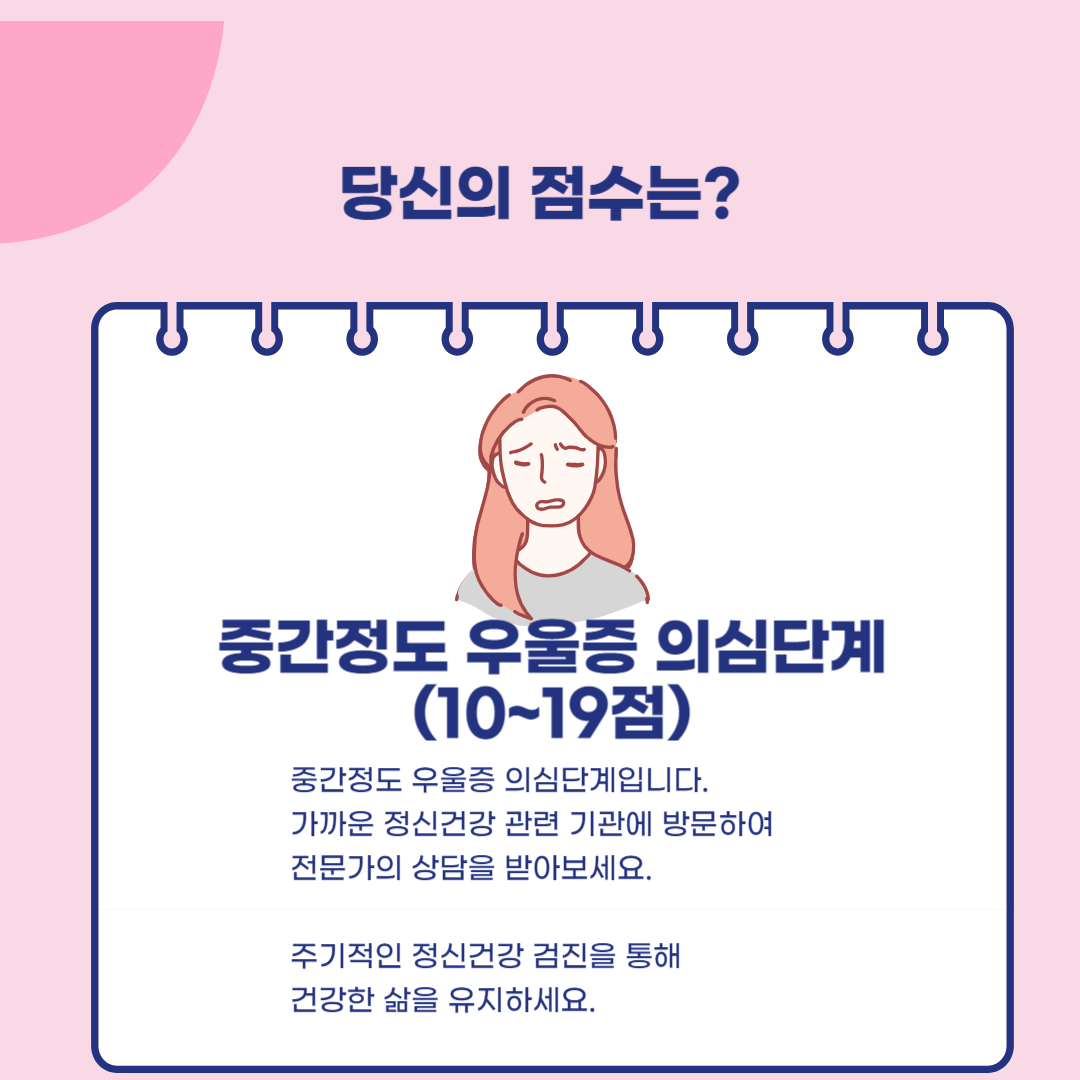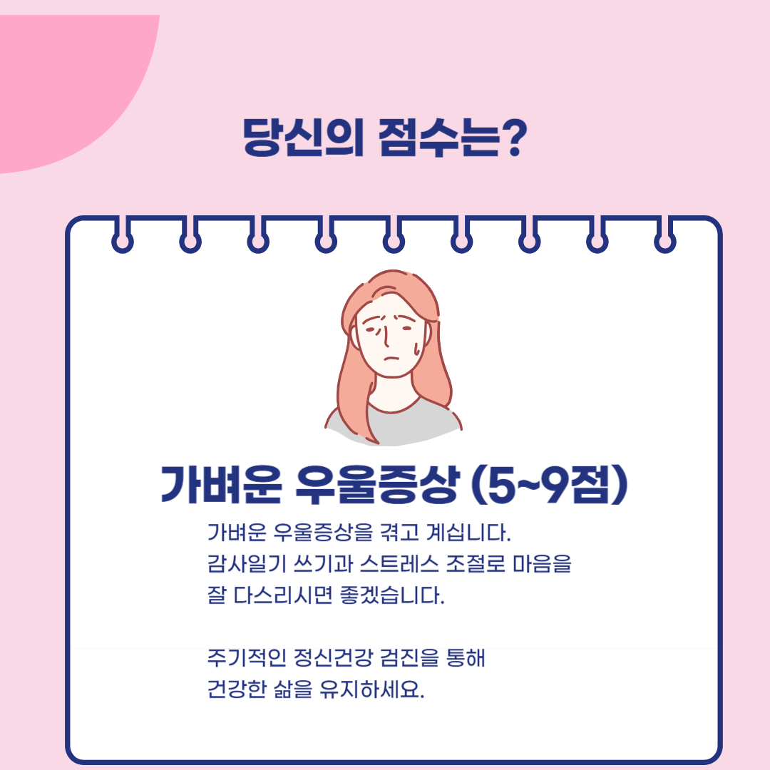 9가지 항목으로 자신의 우울증 여부와 그 정도를 간단하게 검사할 수 있습니다.