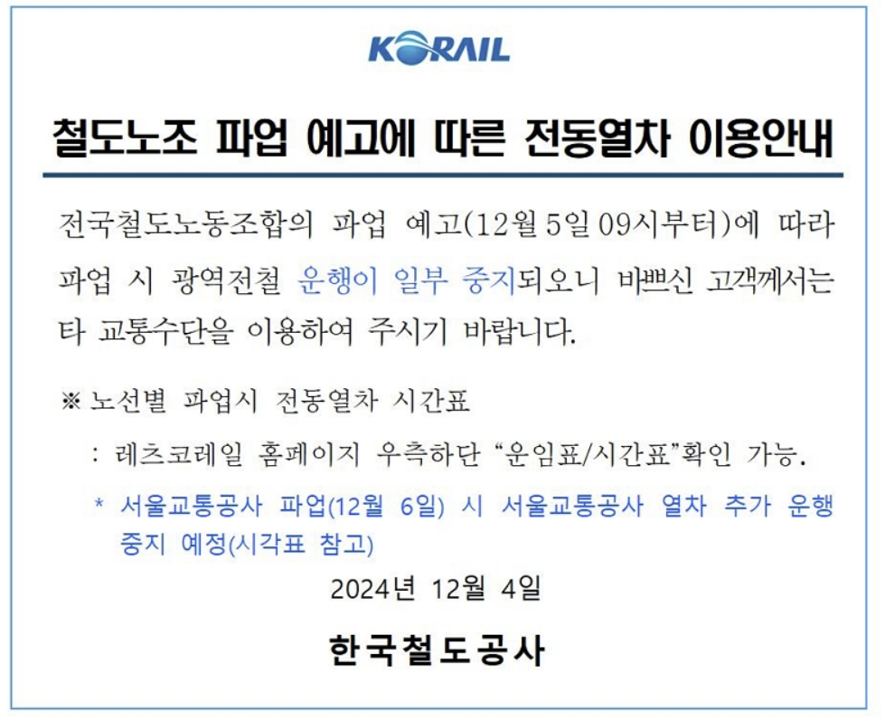 철도노조가 임금 인상과 인력 감축 중단 등을 요구하며 1년 3개월 만에 파업을 예고했습니다. 국토교통부는 대체 인력을 투입해 열차 운행률을 평시 대비 약 70% 수준으로 유지할 계획입니다. 파업시 변경된 시간표 확인하세요.