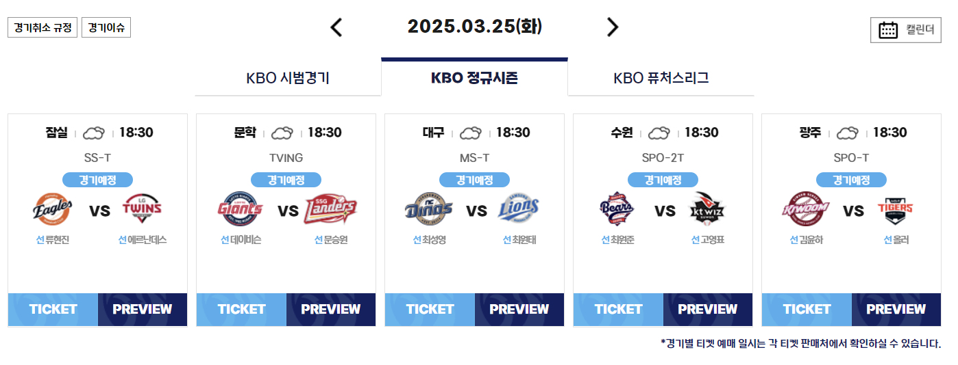 - 시범경기: 2025년 3월 8일(토) ~ 3월 18일(화)